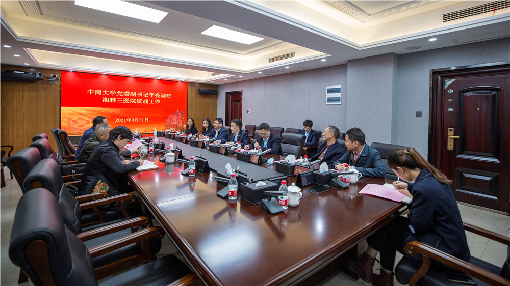 3月31日上午,中南大学党委副书记、统战部长(兼)李亮到湘雅三医院就统战工作展开调研,校党委统战部常务副部长刘建华、副部长李燕峰陪同。湘雅三医院党委书记何庆南,农工民主党湖南省委副主委、湘雅三医院院长张国刚,医院党委副书记杨飞龙,湘雅三医院各民主党派代表人士参加会议。