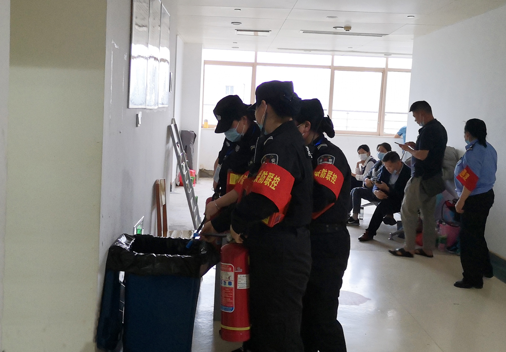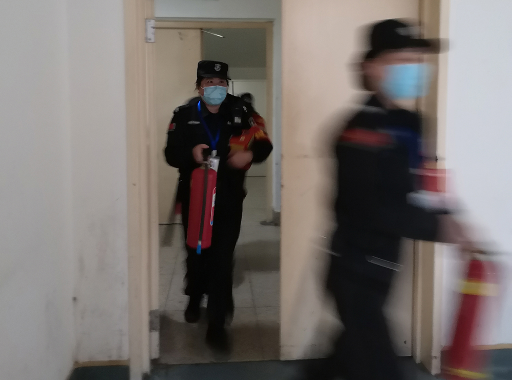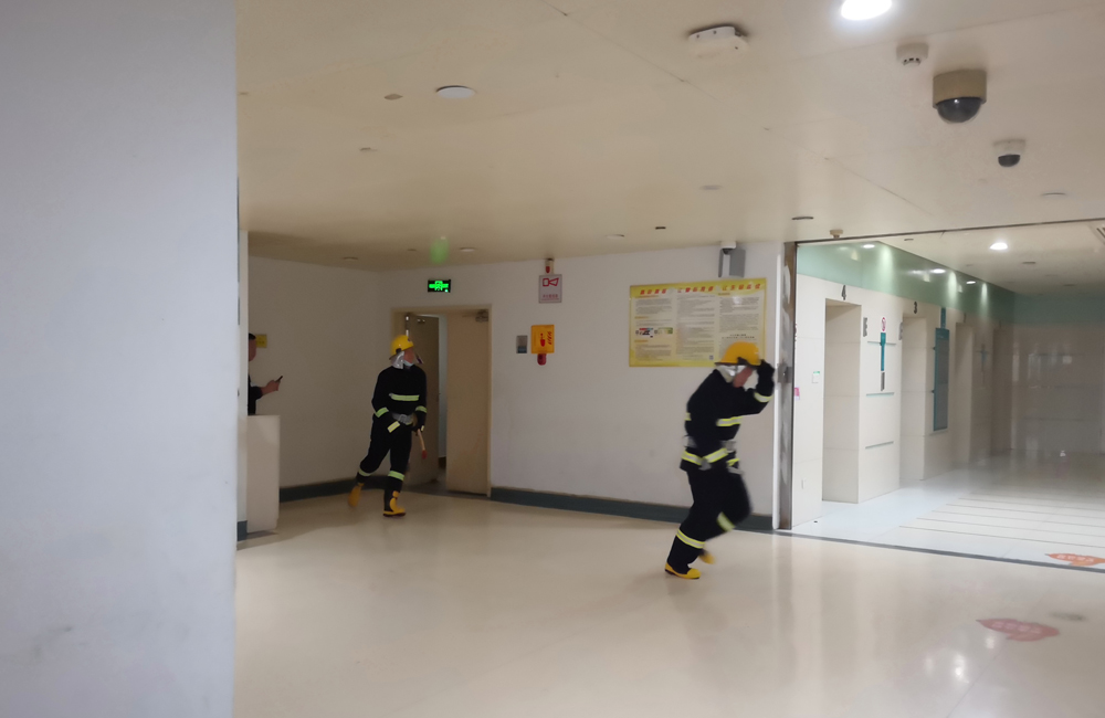此次拉练以外科楼七楼发生火灾为特定场景,消控室收到火情警报后,立即通知义务消防队,并启动消防广播、声光报警、排烟等消防设施。楼层保安员和一楼机动队员接到警情,按照应急预案就地拿起灭火器开始扑灭火情。义务消防队员立即穿上作战服、携带消防水枪、灭火器和消防斧等消防装备,火速赶往现场。