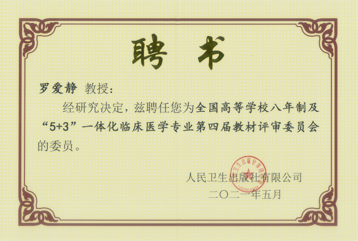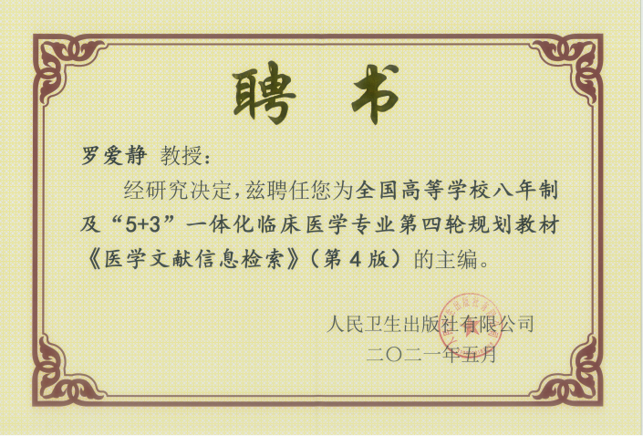 2021年5月21-23日,全国高等学校八年制及“5+3”一体化临床医学专业第四轮规划教材主编人会在武汉召开。继担任《医学文献信息检索》第2版、第3版主编之后,罗爱静教授再次当选全国高等学校八年制及“5+3”一体化临床医学专业第四轮规划教材《医学文献信息检索》第4版主编,并被聘任为第四届教材评审委员会委员。