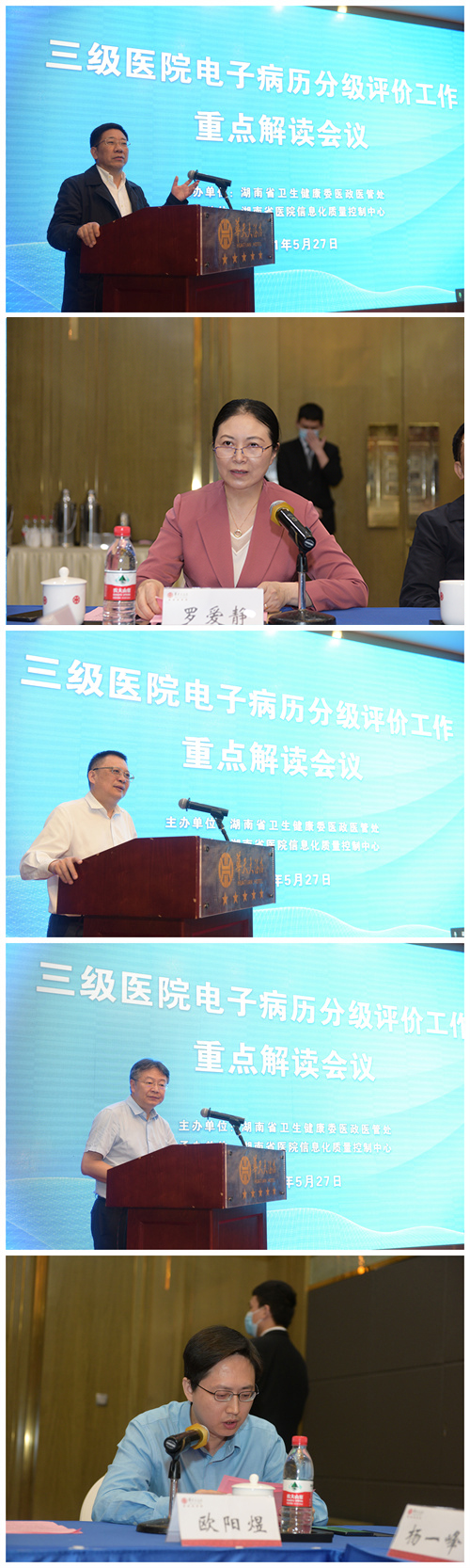 5月27日,由湖南卫生健康委医政医管处主办、湖南省医院信息化质控中心承办、中南大学湘雅三医院协办的“湖南省电子病历系统应用水平分级评价标准重点解读及湖南省医院信息化质控中心换届工作会”顺利召开。湖南省卫健委医政医管处处长王若平,主任欧阳煜,湖南省医院信息化质控中心主任、中南大学湘雅二医院党委书记罗爱静,中南大学湘雅三医院院长张国刚,国家卫生健康委医院管理研究所医疗信息化研究部主任舒婷和国家心血管病中心副主任、阜外医院赵韡副院长,中南大学湘雅二医院副院长杨一峰参会。同时,全省近300家医疗机构线上收看会议,各位地市级卫健委医政科长和各三级医院领导参会。