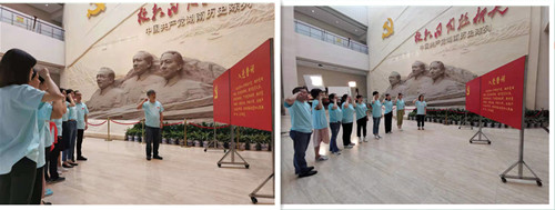 在党史陈列馆大厅“敢教日月换新天”雕塑前,张浩、易斌分别带领所属支部全体党员重温入党誓词,感悟初心使命。张浩书记带领大家参观了展厅,通过照片、书报、文件等史料,回顾了中国共产党领导湖南人民进行革命、建设、改革的光辉历程,感受革命先烈团结奋斗的革命精神以及为民牺牲的大无畏精神。