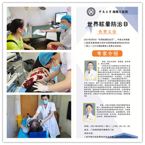 6月9日是第五个“中国眩晕防治日(China Vertigo Prevent Day)”及“世界眩晕防治日(World Vertigo Prevent Day)”,当日上午,中南大学湘雅三医院耳鼻喉科眩晕中心蒋明副教授带领团队进行了以“认识耳石,远离眩晕”为主题的惠民爱心义诊活动。
