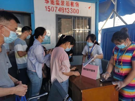 利民之事,丝发必兴。由于湖南省与广东省交界,人口相互流动性大,近期门诊防控管理又拉起了警报。2021年6月7日门诊部副主任彭兰及办公室老师照常巡查门诊情况,在门诊前坪发现有一对七十多岁的老夫妻来院就诊,没有预约挂号,无法进入门诊楼,人工预检分诊窗口排满了人,老夫妻不知所措。还有个别中年人,对智能机使用不熟练,焦头烂额的学习预约挂号。发现这一情况后,门诊部马上组织办公室工作人员现场协调并商讨对策,最后决定把原来门诊五楼病友服务中心的预约挂号工作人员迁移到门诊前坪搭建临时预约挂号便民服务点。不到半个小时,门诊病友服务中心的工作人员,没有电脑、没有凳子,在简易的桌子前开始接待患者,主要负责预约挂号、答疑咨询。截至2021年6月11日,病友服务中心每日上午8:00-11:00,下午14:30-16:30派驻2名工作人员在门诊前坪指导患者。