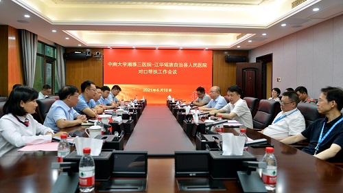 6月10日上午,江华瑶族自治县(以下简称“江华县”)县委常委、副县长张国栋,县卫生健康局党组成员、副局长杨善君,县人民医院党委书记李昌江、副院长伍光晗、纪委书记陈华琳,县人民医院副院长、县第一人民医院党委书记李希俊及县人民医院相关职能部门负责人等一行到访中南大学湘雅三医院,并赠送“瑶族织锦”。医院党委书记何庆南,院长张国刚,党委副书记、纪委书记张劲强,党委委员、副院长欧阳文及相关职能部门负责人参加会议。会议由张劲强主持。