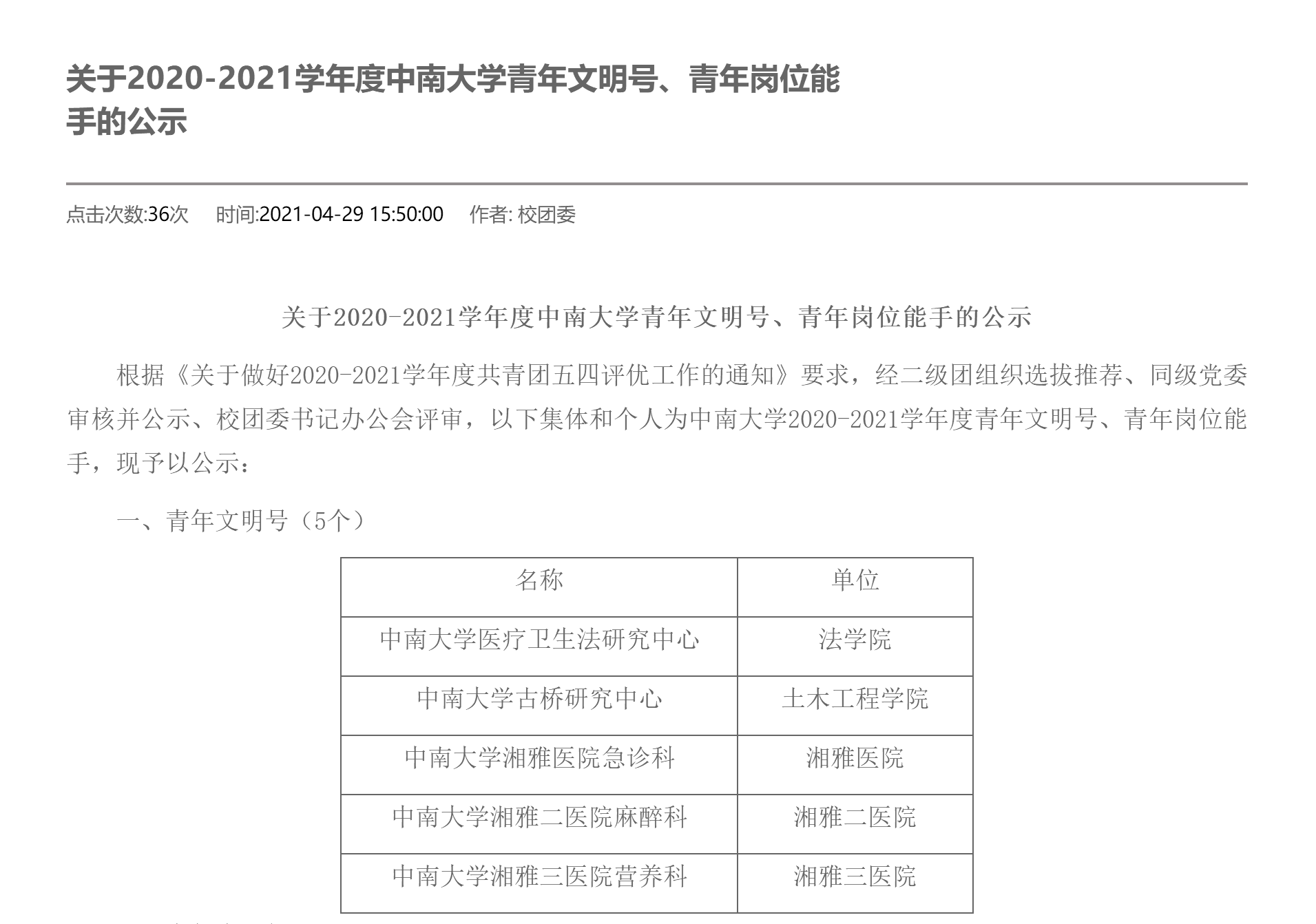 近日,中南大学湘雅三医院营养科收获校级“青年文明号”荣誉奖牌。中南大学2020-2021学年青年文明号于4月29日给予表彰公示,全校仅有5个集体获得,医院营养科脱颖而出,获此殊荣。