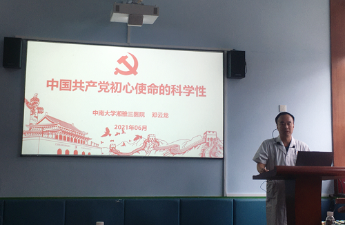 6月22日下午4点,第二党总支儿科党支部开展了主题党课教育活动,中南大学湘雅三医院党委委员、副院长邓云龙受邀讲授题为“中国共产党初心使命的科学性”的党课。第二党总支书记苏莉、妇儿片区科护士长卜平元、儿科所有党员以及研究生、住培医生共50余人参加了此次党课活动,会议由儿科党支部书记陈志衡主持。