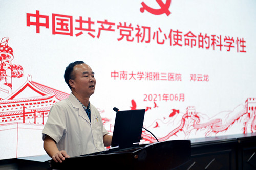 6月22日14:30,中南大学湘雅三医院第一党总支开展党史学习教育,医院党委委员、副院长邓云龙在外科楼二楼多功能厅以《中国共产党初心使命的科学性》为题讲专题党课,第一党总支党员、发展对象、入党积极分子共100余人聆听学习。
