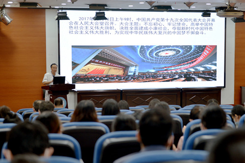 邓云龙副院长首先引出,美国著名历史学家、最负盛名的中国观察家、“头号中国通”费正清在《美国与中国》中提出观点——中国有一股内在的精神力量,这种力量来自于几千年文化的骄傲与自觉性,不是外在的力量可以摧毁的。接着展开讲述了中国共产党为中国人民谋幸福、为中华民族谋复兴的初心与使命,以及紧紧围绕“为什么为人民谋幸福,为民族谋复兴是科学的、正确的?”进行分析。他还独辟蹊径,从个体生存、种族繁衍、物种进化、生物遗传等客观的角度探讨了中华文明延绵不绝、不断辉煌的奥秘,有力地论证了中国共产党初心使命的自然科学性及社会科学性,同时阐述了中国共产党“全心全意为人民服务”的宗旨是凝聚、团结和领导中华民族不断前进的伟大力量。