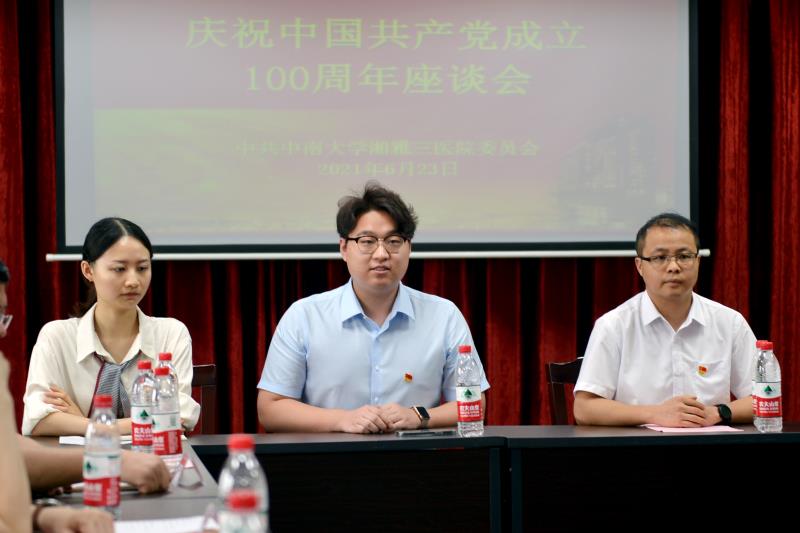 6月23日下午3点,中共中南大学湘雅三医院委员会在离退休多功能厅召开庆祝中国共产党成立100周年座谈会。党委书记何庆南,党委副书记杨飞龙,党委副书记、纪委书记张劲强出席座谈会,8名老党员老干部、相关职能部门负责人、部分青年职工和学生党员代表20余人参加座谈会。会议由党委副书记杨飞龙主持。