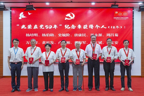 会上,党委副书记、纪委书记张劲强宣读表彰决定,向12名老党员颁发“光荣在党50年”纪念章,对25名“优秀共产党员”、5名“优秀党务工作者”和9个“先进基层党组织”予以表彰,对获得校级荣誉的集体和个人一并表彰。