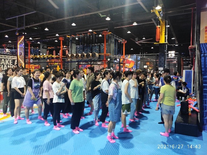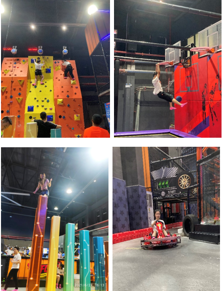 团队活动结束后,开始了2小时的自由活动时间。同学们散布在近5000平方米的蹦床公园的各个角落,随意玩耍。在蹦床、卡丁车、攀岩、光影体验等多个游玩项目中大家重拾童年的乐趣,充分感受着弹跳悬空的魅力与高空挑战的刺激。