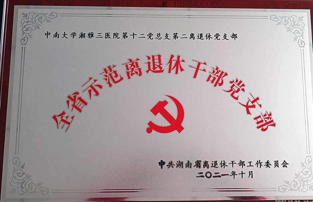 近日,中南大学湘雅三医院离退休党总支从中共湖南省委离退休干部工作委员会获悉,医院离退休党总支第二党支部获评第六批“全省示范离退休干部党支部”荣誉称号。