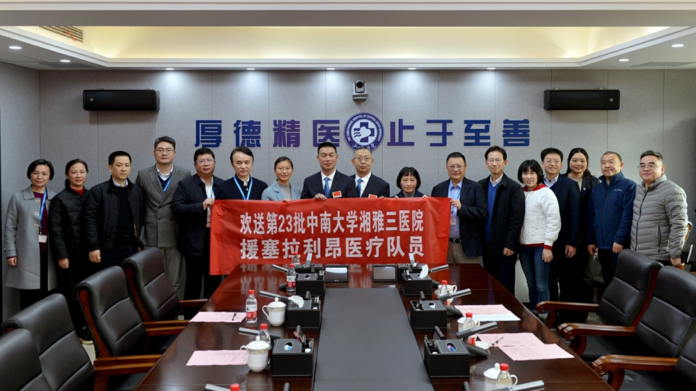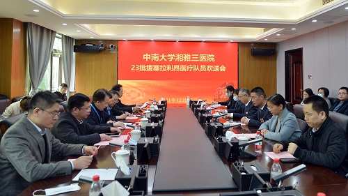 12月20日下午,中南大学湘雅三医院在综合楼一会议室举行援塞拉利昂医疗队员欢送会。医院党委书记何庆南,院长张国刚,党委副书记杨飞龙,党委委员、副院长欧阳文,以及中国(湖南)第23批援塞拉利昂医疗队副队长、湘雅三医院队员—超声科副主任医师肖际东,手术室主管护师王潇和家属,相关科室党总支书记、职能部门负责人等参加欢送会。会议由党委委员、副院长朱利勇主持。