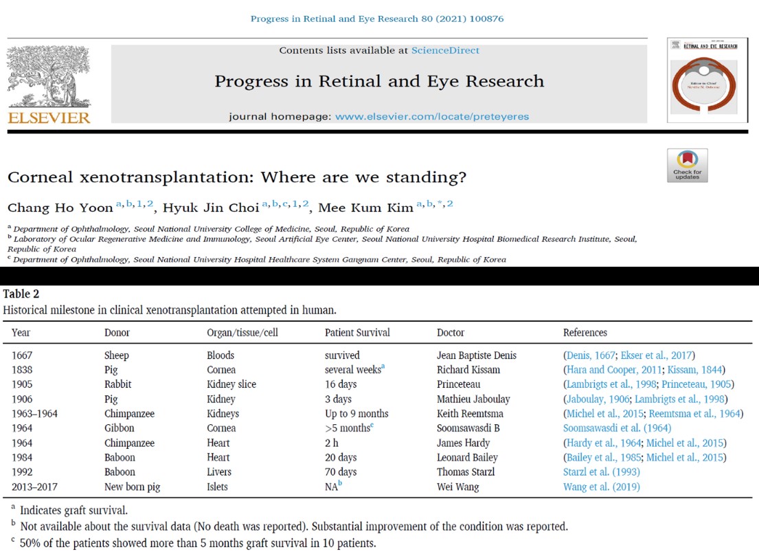 近期,2021年国际异种移植协会理事会理事、韩国国立首尔大学Mee Kum Kim教授在国际顶刊《Progress in Retinal and Eye Research杂志》(IF:21.198)总结了异种移植的发展历史,将中南大学湘雅三医院王维教授团队列入人类临床异种移植尝试的历史里程碑。