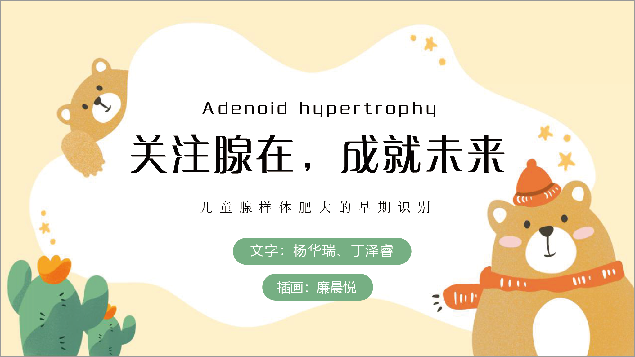 比赛作品形式多样,有传统的图文稿、精心设计的宣传海报,还有微信小程序及科普视频等。经过评选,由廉晨悦、杨华瑞、丁泽睿同学联合创作的作品《关注“腺”在,成就未来》荣获一等奖。该作品以卡通插画形式宣传了儿童腺样体肥大的识别与诊治,科普性强,文字通俗易懂,作品设计精美。