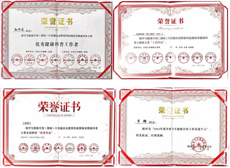 由国家卫生健康委、中央宣传部、科技部、中国科协共同组织开展的“健康知识普及行动—2021年新时代健康科普作品征集大赛”中,中南大学湘雅三医院《“手筑健康”幸福三院幸福中国—全民洗手舞》、《看完,你绝不会再放弃这项检查》获得微视频类优秀作品奖;《不喜欢喝水会怎样?看完吓得赶紧端起水杯》、《健康生活方式和健康素养—选择》获微视频类入围;《慢性阻塞性肺疾病患者居家肺康复》获图书类优秀作品奖;《湘雅名医答疑-外伤与康复 180问》获图书类入围;《吃它吃它就吃它!肠道护卫大将军!》获海报类入围。