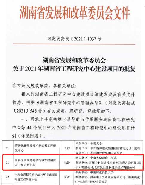 近日,湖南省发展与改革委员会批复了2021年度湖南省工程研究中心建设项目名单,中南大学湘雅三医院获批“全科医学家庭健康智慧管理湖南省工程研究中心”。本中心由中南大学湘雅三医院牵头,联合苏州中科先进技术研究院、北京悦世佳联健康技术有限公司、彩之物科技(深圳)有限公司共同申报,中心主任由湘雅三医院全科医学科姚晨姣教授担任。
