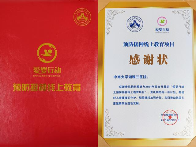 近日,中南大学湘雅三医院产科收到中华预防医学会的一封感谢状,感谢医院产科积极开展中华预防医学会的“爱婴行动之预防接种线上教育”项目。