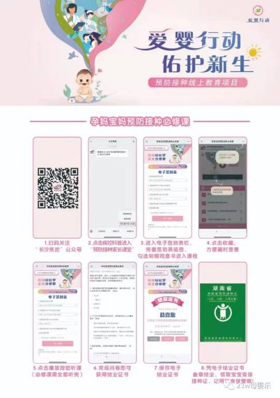 作为爱婴医院,中南大学湘雅三医院产科以产科微信公众号“23w母婴乐”为平台,指引产妇及其家属线上学习预防接种知识,宝宝出生后,完成学习的家属凭电子结业证书盖章结业,即可领取湖南省疾病预防控制中心颁发的疫苗接种证。