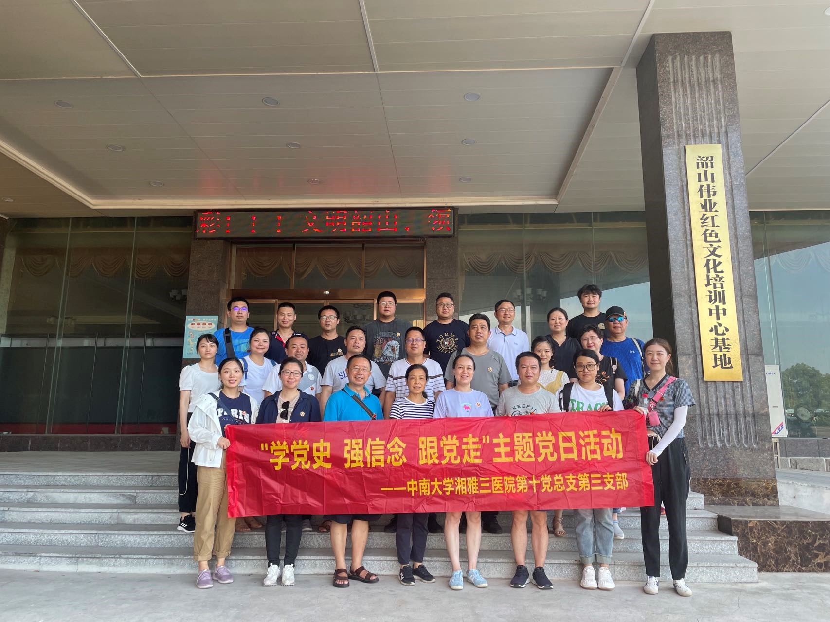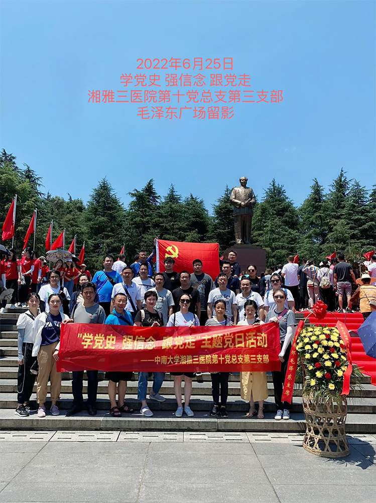 6月25日,正值在建党101周年来临之际,中南大学湘雅三医院第十党总支第三党支部全体党员前往伟人故乡韶山开展“学党史、强信念、跟党走”党员学习教育活动。此次活动由医院第十党总支书记黎俊平、支部书记王安莉组织,活动旨在激励全体党员干部进一步坚定理想信念,提高党性修养,强化责任担当,在各自的工作岗位上发光发热继而做出更大贡献。