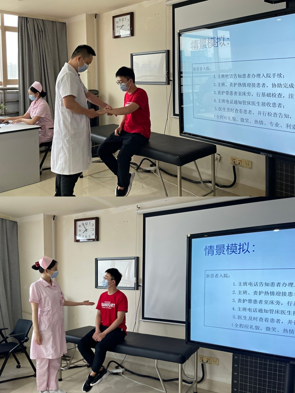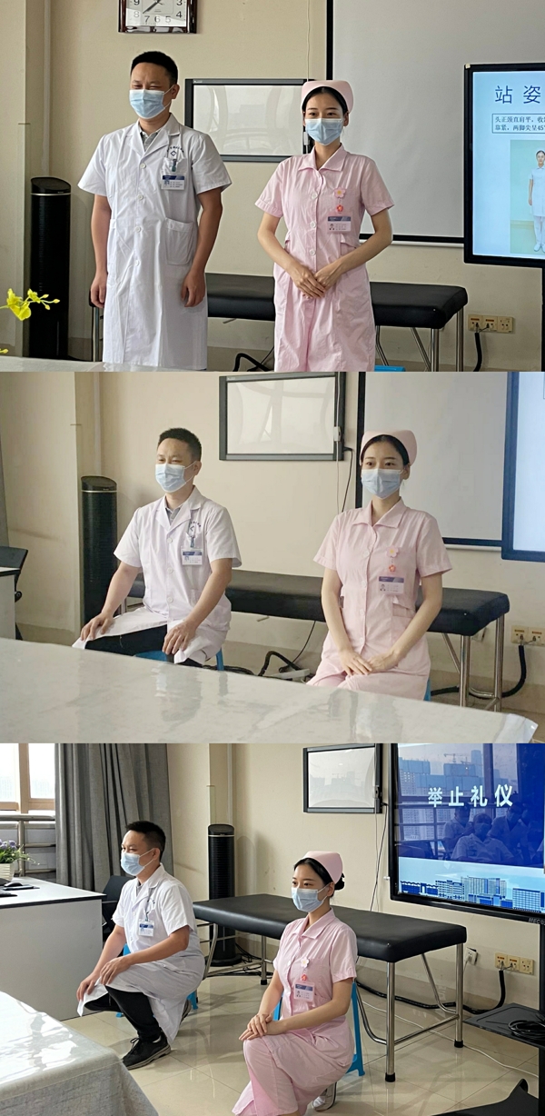 “不学礼,无以立”,在培训课上,主管护师易杨梦妮就礼仪的原则、仪态礼仪、仪容礼仪、仪表礼仪、举止礼仪结合临床工作与实际生活进行了剖析与讲解,并由王正光和王梦娇两位老师现场展示仪表礼仪,让培训课程更加生动、形象。易杨梦妮还模拟了不同情绪、不同状态下接听电话时的不同语气和语调,通常面带微笑接听电话时语气会更加柔和,语调也更有亲和力。最后情景再现,由王正光、郭咪咪、王梦娇、冯万江现场模拟收治新入院患者,给大家带来最直观、最真实的感受。