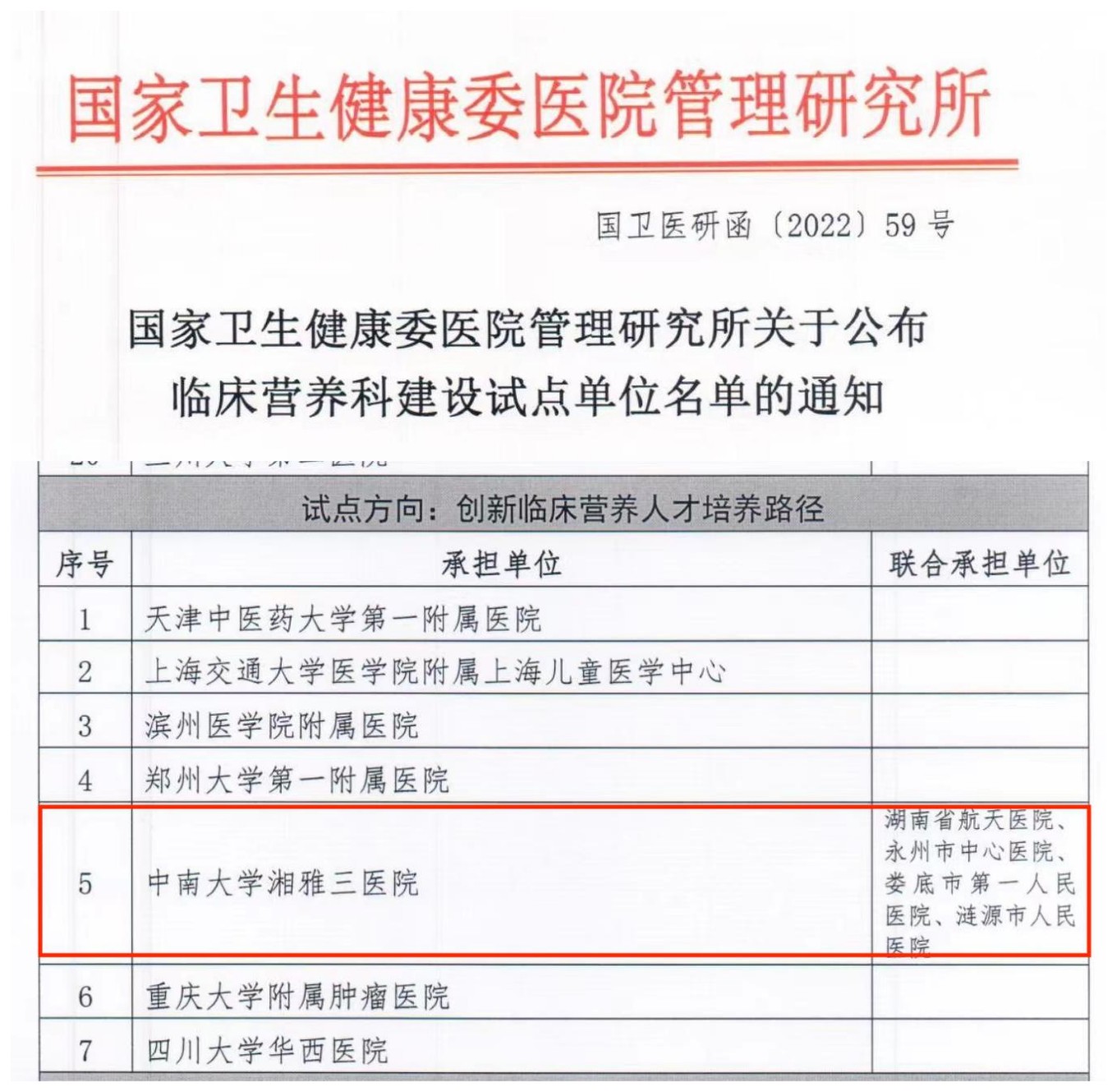 6月28日,国家卫生健康委管理研究所公布临床营养科建设试点单位名单,中南大学湘雅三医院联合湖南省航天医院、永州市中心医院 、娄底市第一人民医院、涟源市人民医院等4家医院入围,试点方向为创新临床营养人才培养路径。