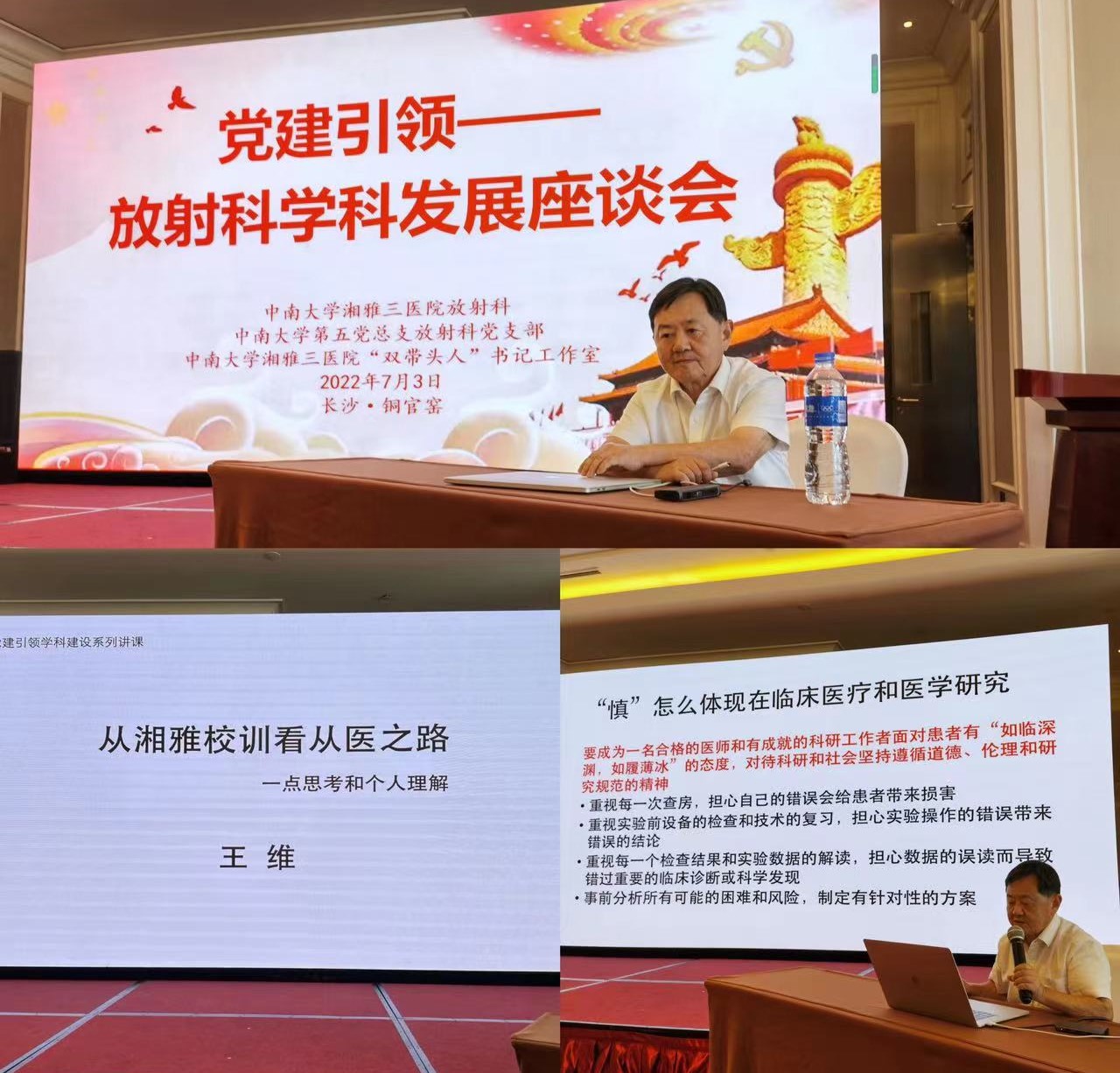 座谈会第一部分,放射科党支部原支部书记王维应党支部邀请,为支部全体党员和教职员工讲述了一堂生的动党课——从湘雅校训看从医之路。他首先回顾了中国共产党的百年奋斗历程,让大家感受到了中国共产党波澜壮阔、筚路蓝缕的艰苦创业史。然后讲述了湘雅的百年建院历史。他提出:湘雅的艰苦创业历程正是与中国共产党的百年峥嵘同呼吸共命运。接着他一字一字地解读了湘雅“公勇勤慎、诚爱谦廉、求真求确、必遂必专”的校训,他把湘雅校训中的每个字从说文解义、引申含义以及怎样应用在医疗事业中等几个方面为全体职工详细解读,让全体职工深刻感受到湘雅精神的真实内涵。最后,他把“行医”一词的概念做了思想的升华:“把行医当做一份职业,作为湘雅人,至少要成为优秀的医务工作者;把行医当做一份事业,作为湘雅人,就要立志成为拔尖的医学科学家。只有把职业和事业结合起来,把个人命运和国家命运连接起来,才能往小说在生活上取得了满足,往中说在工作中取得了成就,往大说为国家做出了贡献。”