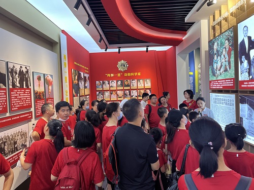 刚来到展览馆,孩子们就迫不及待地进入红色展厅,好奇地跟随着导览工作人员参观了“众心向党自立自强——党领导下的科学家"主题展。展览以中国共产党的坚强领导和伟大指引为主线,以科学家精神内涵为核心,通过讲解员声情并茂的讲解,展览墙图文并茂的呈现,配合书信手稿、影像资料等,将“两弹一星”精神、西迁精神、载人航天精神、抗疫精神、探月精神等伟大精神融汇贯穿其中,为大家立体呈现了百年来在党的坚强领导下,科技工作者投身科学救国,科技报国、兴国、强国伟大事业的感人故事,让科学家精神的种子种在了孩子们的心中。