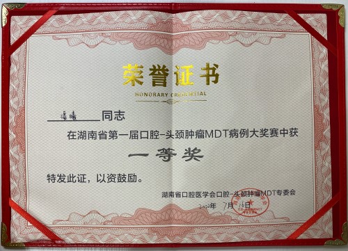 2022年7月16日,湖南省第一届口腔-头颈肿瘤MDT病例大奖赛(决赛)在长沙举行。中南大学湘雅三医院肿瘤科潘曦副主任医师从中南大学湘雅医院、中南大学湘雅二医院、中南大学湘雅三医院、湖南省肿瘤医院及多家地市级医院选派的选手中脱颖而出,以总分排名第一的成绩斩获一等奖。