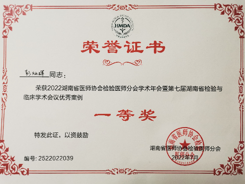 在同一时期,中南大学湘雅三医院检验科主管技师彭灿辉在“2022年湖南省医师协会检验医师分会学术年会暨第七届湖南省检验与临床学术会议”案例汇报大赛中荣获一等奖。该会议由湖南省医师协会检验医师分会主办,以“提升检验医(技)师能力,助力健康湖南发展”为主题,采取线上线下相结合方式进行,来自省内近100名专家学者,以及通过网络直播参与的6000余名检验医学工作者,共同分享了本次检验医学学术盛宴。