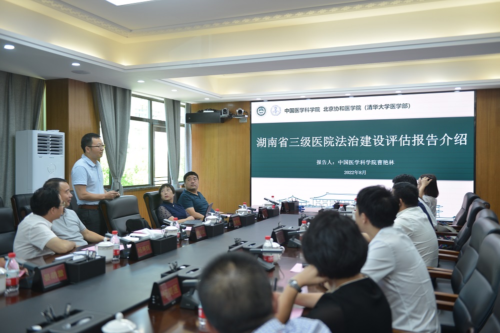 中国医学科学院医学信息研究所医疗卫生法制室主任曹艳林从研究背景、方法、过程、评价结论等方面对湖南省医院法治建设第三方评估工作进行详细阐释,对湖南省公立医院法治建设工作走在全国前列表示祝贺,并肯定湘雅三医院法治建设工作已形成的特色。