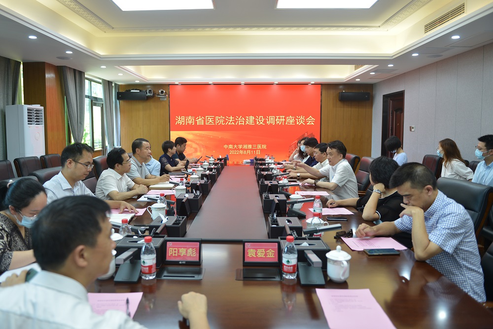 8月11日,湖南省医院法治建设调研座谈会在中南大学湘雅三医院顺利召开。湖南省卫生健康委员会法规处处长曹跃斌、中国医学科学院医学信息研究所医疗卫生法制室主任曹艳林,中南大学湘雅医院、中南大学湘雅二医院和湖南省直医院院领导、法治部门负责人和医院法律顾问参加会议,会议由曹跃斌主持。