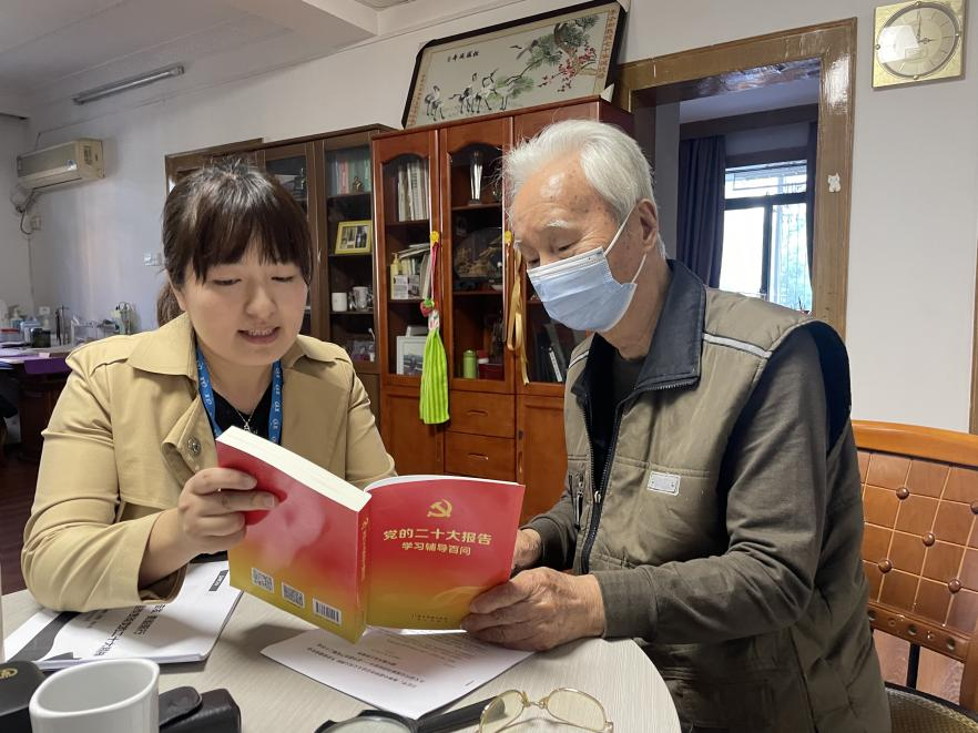 10月25日,党的二十大报告全文发布,为了让年纪偏大、行动不便、眼睛不好的离退休党员思想“不掉队”,离退休党总支第一时间上门为老同志们读原文,讲重点,让老同志们足不出户也能感受到学习的热潮。