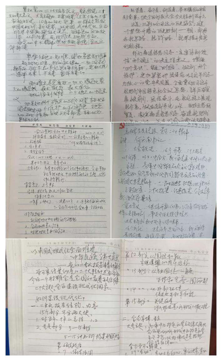 从党的二十大开幕以来,离退休老党员们就自发开展多种形式的学习,并主动做好学习笔记、体会,在支部思想交流会上畅谈感想。离退休党总支书记杨华介绍,有65名老党员撰写了自己的所思所想。胸外科老教授刘建新在笔记中写到:“总书记的报告句句激动人心!作为一名老党员,我一定用习近平新时代中国特色社会主义思想武装头脑,竭尽所能发挥余热,为推进中华民族复兴努力奋斗!”
