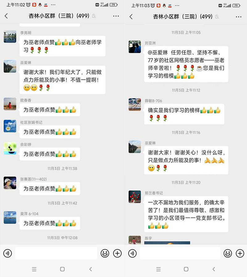 今年78岁的巫爱琳党龄已有45年,退休后她担任了党支部书记、党总支组织委员、特邀党建组织员,兼任杏林社区功能型党支部书记、网格宣传员。面对疫情的严峻形势,她主动报名参加核酸检测志愿者,从9月起,一次不落地参加了社区组织的核酸检测志愿服务。她在学习笔记中写下了自己的感想:“空谈误国,实干兴邦,我感到我们退休的党员、干部,在新征程上不能只做观光客,应该也做实践者。人民健康是社会主义现代化的重要标志之一,我们要在新的以人民健康为中心的事业中,做力所能及的事,出应该出的力,踔厉奋发,发挥余热。”