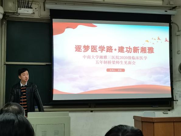 3月1日晚上,中南大学湘雅三医院在湘雅医学院孝骞楼召开第三临床学院2020级临床医学五年制桥梁课师生见面会。医院党委委员、副院长曹科出席,教务部全体成员、教研室教学主任和脱产教师代表、湘雅医学院年级办辅导员,2020级第三临床学院大班143名同学参加本次会议。会议由教务部主任庄权主持。