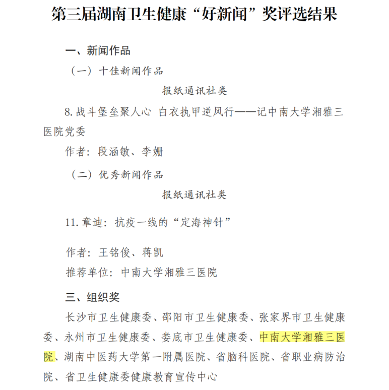 近日,湖南省卫生健康委通报了第三届湖南卫生健康“好新闻”奖评选结果。湘雅三医院荣获组织奖;《战斗堡垒聚人心 白衣执甲逆风行——记中南大学湘雅三医院党委》(作者:段涵敏、李姗)获报纸通讯社类十佳新闻作品;《章迪:抗疫一线的“定海神针”》(作者:王铭俊、蒋凯)获报纸通讯社类优秀新闻作品。