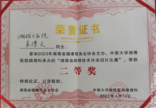 4月15日,由湖南省健康服务业协会主办、中南大学湘雅医院病理科承办的”湖南省病理技术冷冻切片比赛”在长沙隆重举行,湘雅三医院病理科主管技师袁博文斩获冷冻切片比赛二等奖。