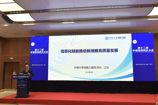 2023年4月15日,中南大学湘雅三医院院长江泓教授受邀出席第十二届中国医院院长大会。在医院信息化管理及医疗创新的机遇与挑战论坛,以“信息化赋能推动新湘雅高质量发展”为题做主题报告。