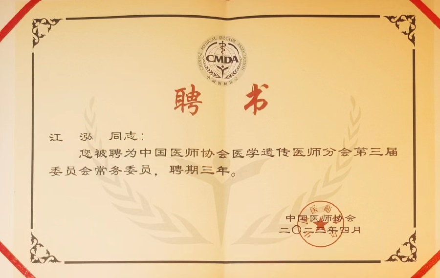4月14日至4月16日,由中国医师协会、中国医师协会医学遗传医师分会主办,湖南省医师协会协办的“中国医师协会医学遗传医师分会2023年会”在长沙召开。会上,中南大学湘雅三医院江泓教授当选中国医师协会医学遗传医师分会第三届委员会常务委员。