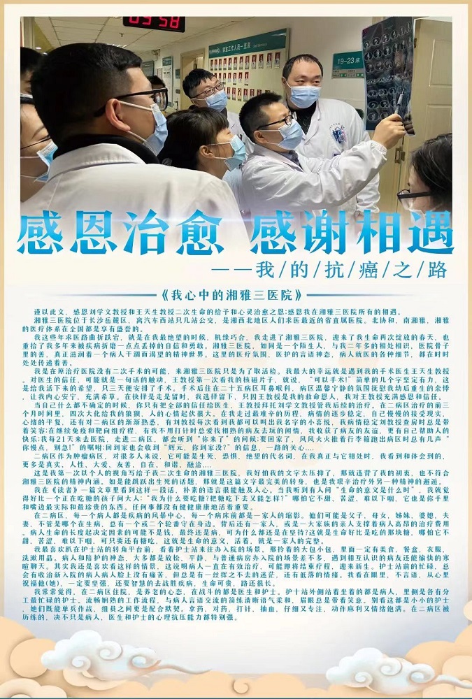 “感恩治愈,感谢相遇”。肿瘤防治宣传周期间,肿瘤科还邀请两名曾经在肿瘤科治疗过的抗癌勇士与病友们分享了自己成功的抗癌经验,他们用深情的话语和诚挚的感情讲述了自己对湘雅三医院肿瘤科的感谢之情,以及对新湘雅肿瘤发展的美好期盼。
