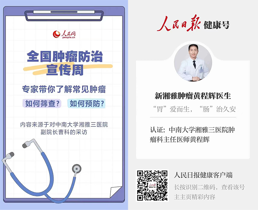 肿瘤防治,科普先行。中南大学湘雅三医院党委委员、副院长、肿瘤科曹科教授在接受人民网采访中,对常见肿瘤的筛查和预防等进行相关讲解,肿瘤科黄程辉教授依托人民日报健康客户端推送大肠癌科普视频,详细介绍了大肠癌的治病流程、术后复查和饮食指导等具体内容。此次,肿瘤科借助媒体传播,积极科普肿瘤防治的相关内容,将有助于增强群众科学防癌抗癌理念,保障人民群众健康。