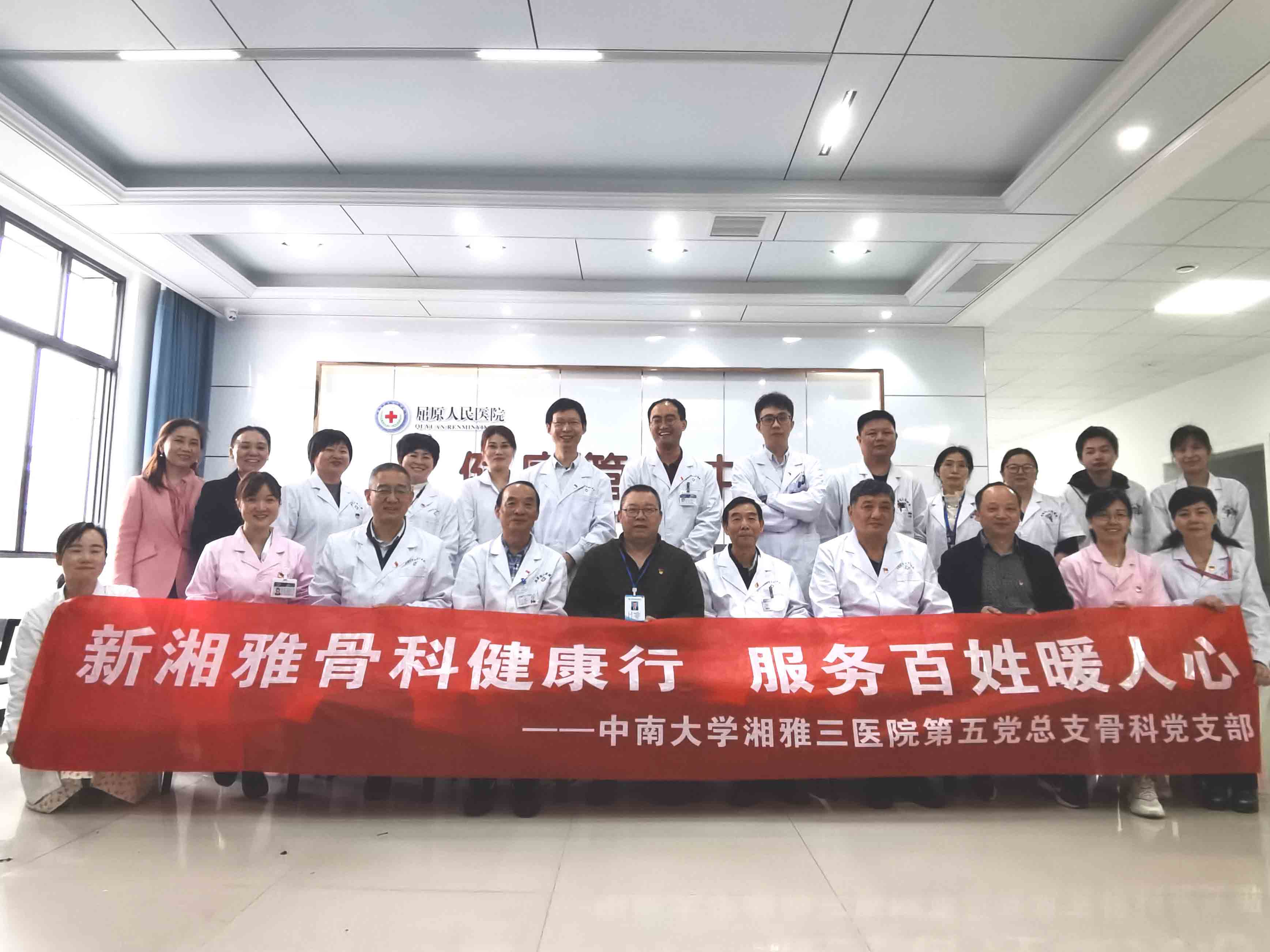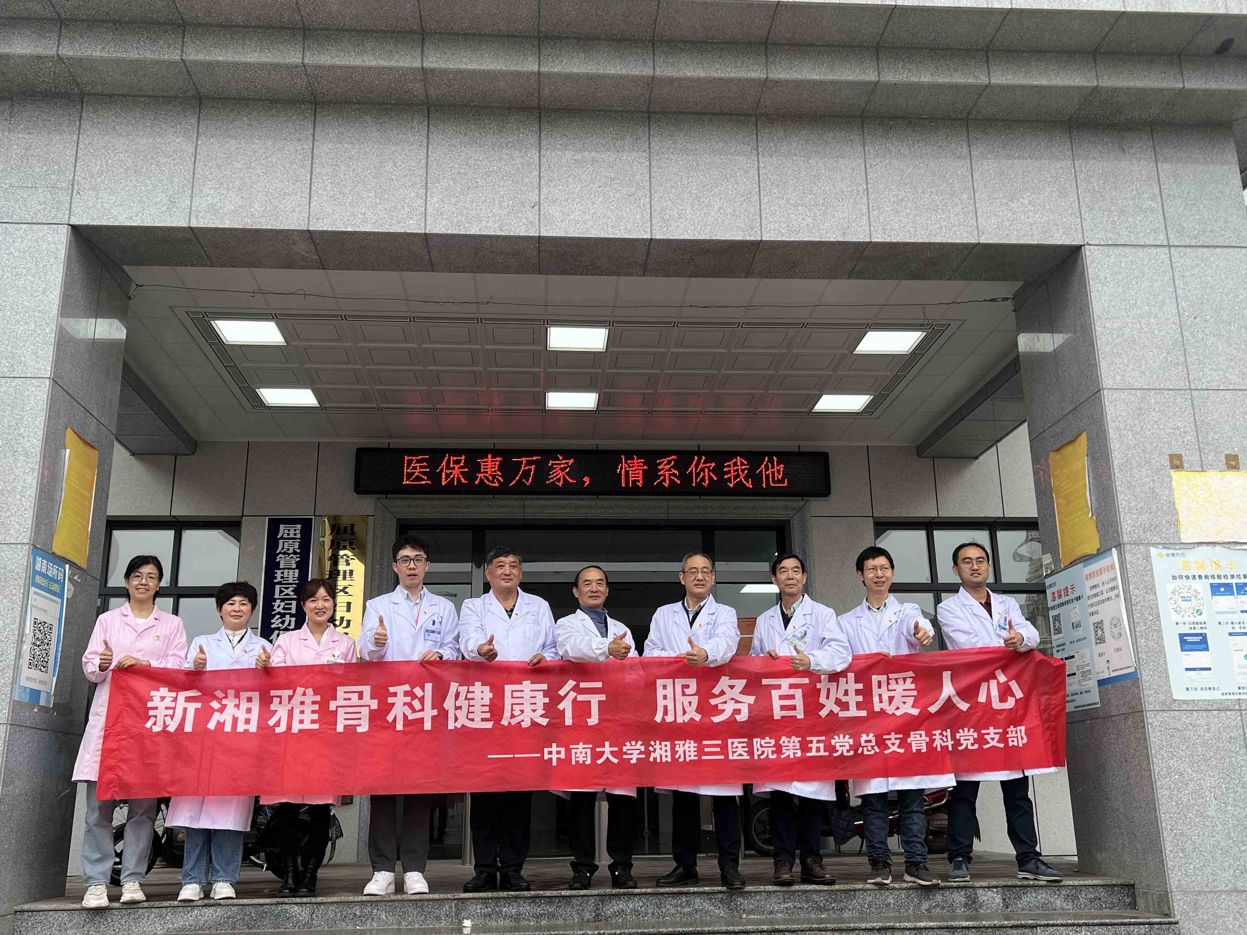4月22日,中南大学湘雅三医院第五党总支骨科党支部党员及骨科业务专家到岳阳市屈原管理区人民医院开展“新湘雅骨科健康行,服务百姓暖人心”医疗和爱心义诊活动,将健康送到岳阳市百姓的家门口。本次义诊宣讲团由中南大学湘雅三医院骨科主任吴松,二十七病区护士长张文秀,骨科张朝跃教授,张迪华、韩利华、何金深、成湘红副教授,曹旭、郭强博士,杨海蓉、刘利主管护师组成。活动旨在进一步做好建立紧密型医联体骨科中心联盟,推进优质医疗资源下沉,促进城乡振兴、推动健康湖南发展。