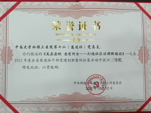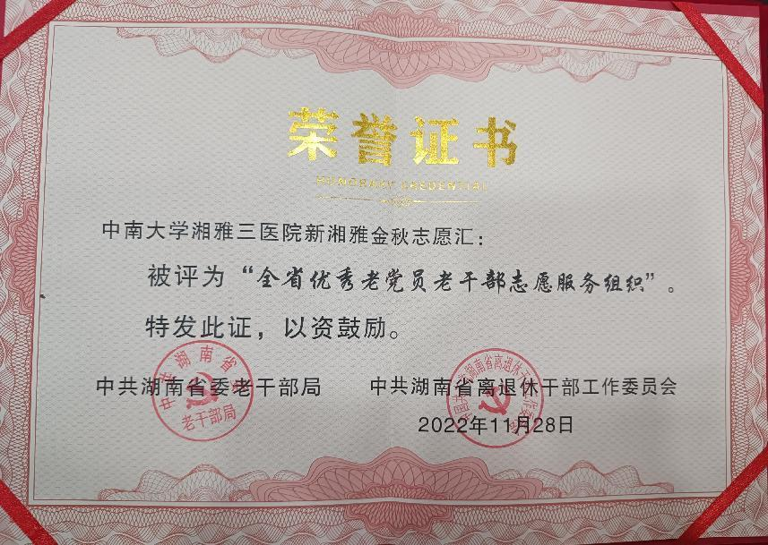 经过多年的发展和积累,离退休党总支建立起了一支党性强、威望高、乐于奉献,100多人的志愿服务队伍,简称“新湘雅金秋志愿汇”。队伍也在不断探索党建新方法、新途径,书写党建新文章。其中,《美在金秋老有所为——打造社区治理新路径》被评为2022年度全省离退休干部党建创新案例。