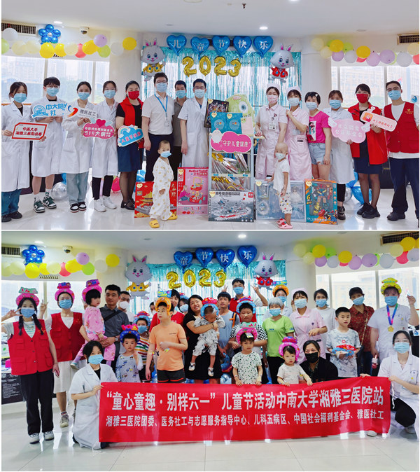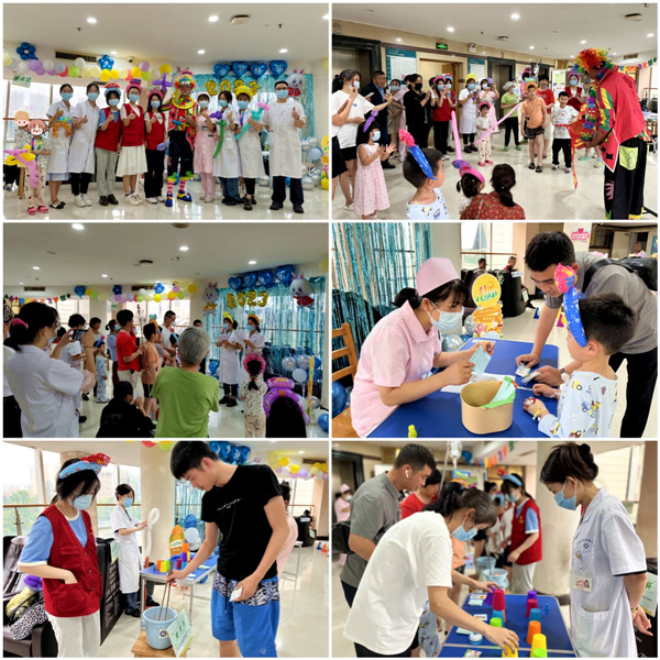 色彩缤纷的气球、各式各样的儿童节礼物、幽默有趣的小丑表演、欢乐洋溢的互动挑战……2023年六一前后,中南大学湘雅三医院团委、医务社工与志愿服务指导中心联合儿科五病区、雅医社工、中大阳光社工、米公益社工,在北京微爱公益基金会、中国社会福利基金会、湖南豪布斯卡物业公司、水滴公益等爱心公益伙伴的大力支持下,从患儿需求出发,精心策划开展了以“童行动 同行动·益童关爱 至善同行”为主题的病房关爱系列活动。院团委书记、医务社工与志愿服务指导中心主任程海威,儿科主任杨明华、儿科五病区护士长蔡骞、新生儿科护士长何利、儿科PICU护士长谭彦娟,以及科室医护人员、驻点医务社工、爱心志愿者和病房患儿及家属等百余人参与了活动。