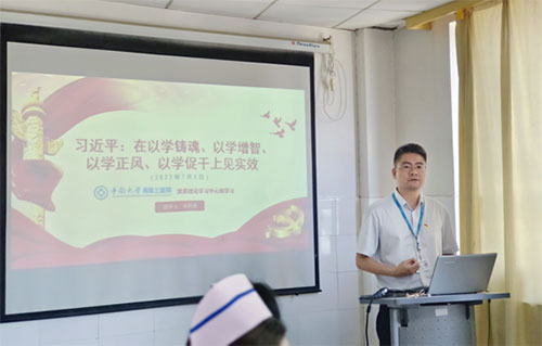 7月6日下午,中南大学湘雅三医院党委委员、副院长朱利勇在内科楼六楼党员活动室讲授题为《在以学铸魂、以学增智、以学正风、以学促干上见实效》的专题党课。第四党总支消化营养科支部全体党员参加,第四党总支书记孙慧蓉主持。