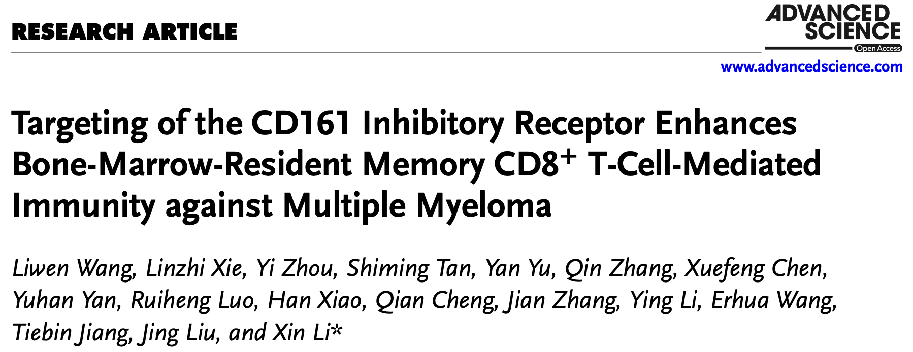 近日,中南大学湘雅三医院血液内科李昕教授团队在国际知名的生命科学领域权威期刊《Advanced Science》(先进科学,中国科学院一区,IF=14.1)发表了题为“Targeting of the CD161 Inhibitory Receptor Enhances Bone-Marrow-Resident Memory CD8+T Cell-mediated Immunity Against Multiple Myeloma”(靶向CD161抑制受体增强骨髓组织驻留记忆CD8+T细胞介导的抗多发性骨髓瘤效应)的原创性论著,在国际上首次揭示了CD161-CLEC2D轴抑制骨髓组织驻留记忆CD8+T细胞抗多发性骨髓瘤功能的分子机制,为多发性骨髓瘤精准靶向治疗提供了新策略。李昕教授为该论文独立通讯作者,血液内科王礼文助理研究员和谢林芝研究生为该论文共同第一作者,中南大学湘雅三医院为第一作者单位和独立通讯作者单位。