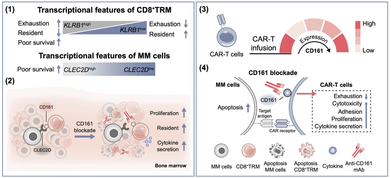 本研究首次在多发性骨髓瘤骨髓组织驻留记忆CD8+T细胞上发现免疫抑制性受体CD161的表达上调,从而使得其在骨髓瘤患者体内“失去了战斗力”。这种“失能”的根源在于CD161作为“刹车”受体,它通过与癌细胞表面的CLEC2D配体蛋白结合,导致组织驻留记忆CD8+T细胞无法发挥作用。团队通过单克隆阻断抗体打断这一结合来“松开刹车”,从而重新激活组织驻留记忆CD8+T细胞对抗肿瘤的能力。这一研究为多发性骨髓瘤的免疫疗法提供了新的靶点和治疗策略。如果未来这种方法普及到临床,或将为多发性骨髓瘤患者带来更持久的疾病控制和更高的生存质量,为血液肿瘤精准治疗开辟新的方向。