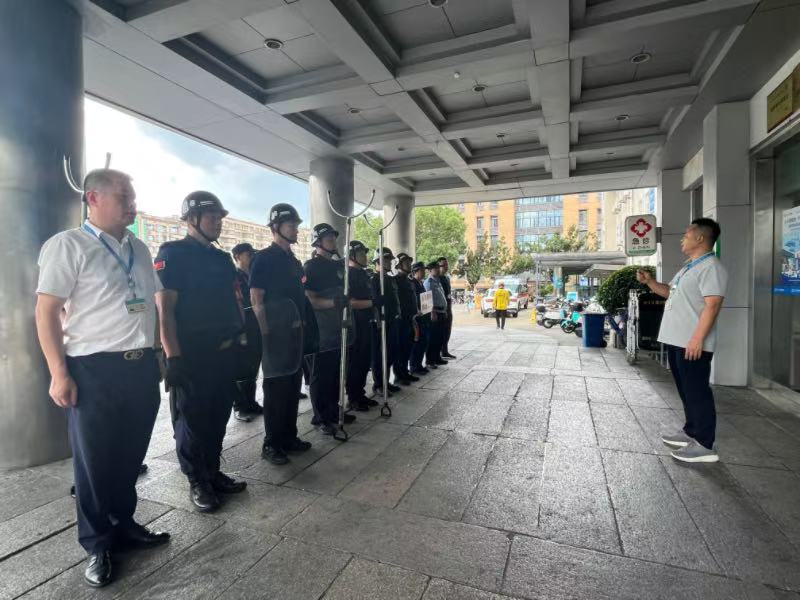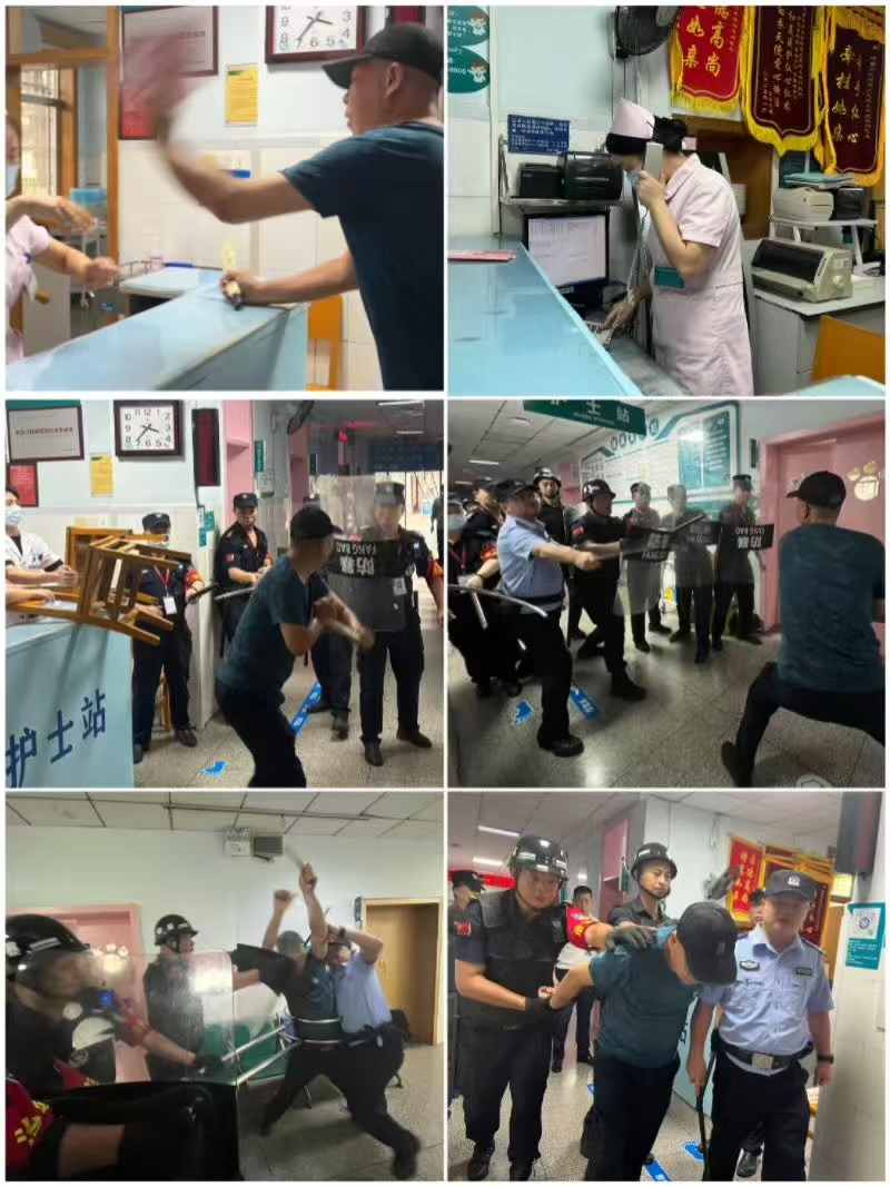 3分钟内形成的第一应急防暴小组,在保护好自身的前提下,积极安抚男子情绪,并将周围患者及家属疏散至安全区域,避免事态升级;5分钟内,驻院民警贺警官及保安队4名增援人员携带盾牌及防暴钢叉迅速抵达现场。一人用防暴钢叉精准控制“男子”下肢,另一人持盾牌压制其上身,仅用30秒便成功将“男子”制服。