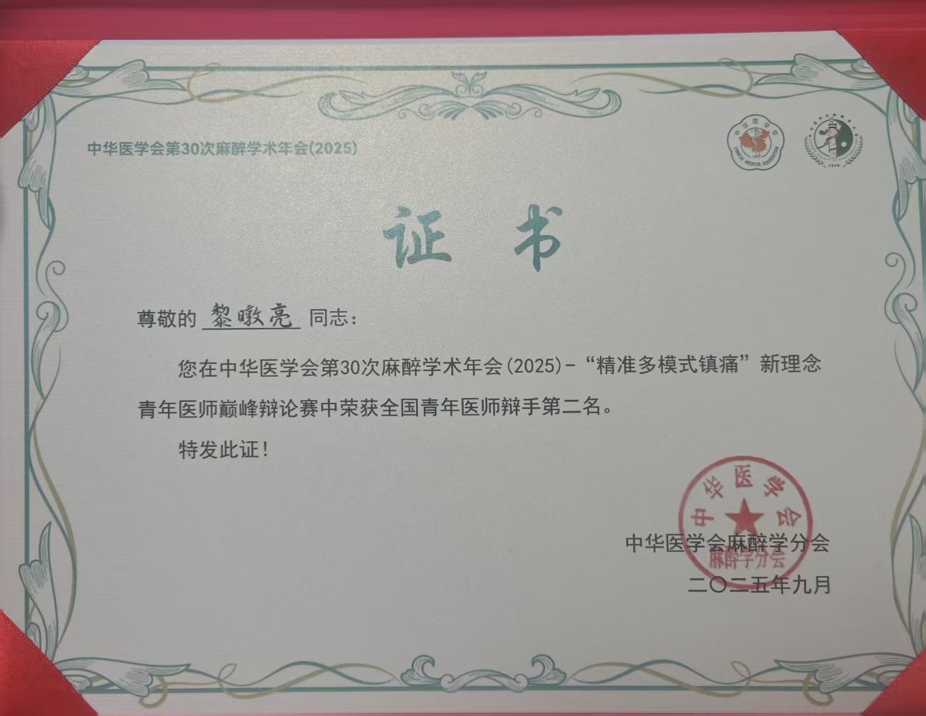 9月18日至9月21日,中华医学会第30次麻醉学术年会(2025)在厦门举行,会上“精准多模式镇痛”新理念青年医师巅峰辩论赛顺利收官。湘雅三医院麻醉科黎暾亮医师暨荣获南区赛第一名后,再次凭借扎实专业功底、敏捷逻辑思维与出色表达能力,从全国众多优秀青年医师中脱颖而出,荣获全国青年医师辩手第二名。